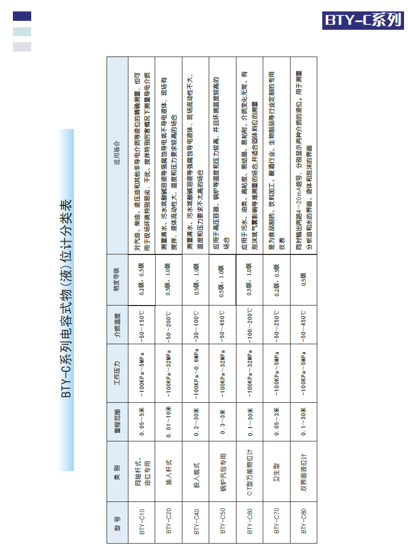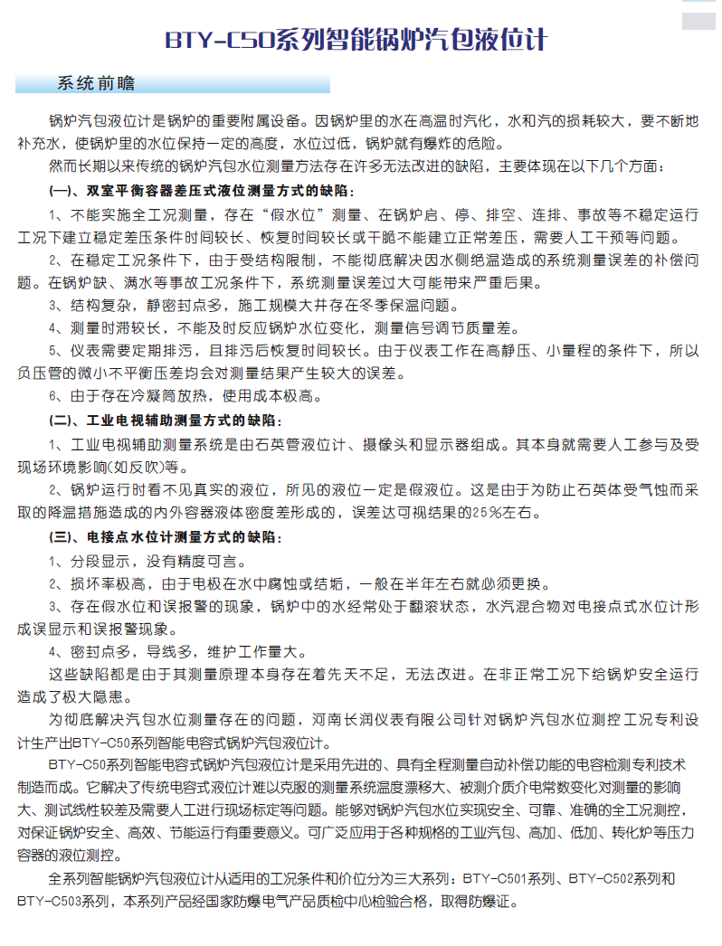 BTY-C系列電容式物位計(jì)采用一種基于全數(shù)字化電容測(cè)量方法,并運(yùn)用多參數(shù)補(bǔ)償技術(shù),研制出一系列高精度的物位計(jì),已經(jīng)在多個(gè)領(lǐng)域試用成功。例如安裝在機(jī)動(dòng)車(chē)輛上的電容式油位傳感器,在各種強(qiáng)腐蝕、高溫、劇毒、爆炸等高危險(xiǎn)場(chǎng)合使用的電容式高溫高壓液位計(jì),能自動(dòng)適應(yīng)各種介質(zhì)的高精度CT型物位計(jì)。這些物位計(jì)在有關(guān)行業(yè)試用,得到了有關(guān)行家的一致好評(píng)。
