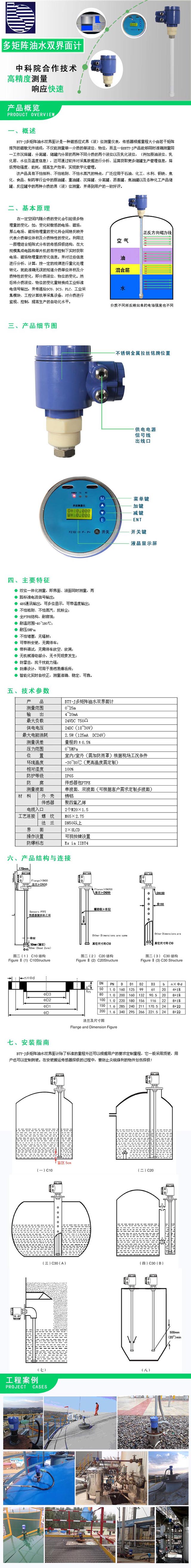 BTY-J多矩陣油水雙界面計是一種磁感應式界(液)位測量儀表,傳感器根據(jù)量程大小由若干矩陣排列的磁敏元件組成,不僅能測量單一介質(zhì)的單液位、物位,而且一臺BTY-J產(chǎn)品能夠同時準確測量同一工作沉降罐、分離罐、儲罐內(nèi)分層的兩種不同介質(zhì)的兩個液位以及乳化液位,(例如原油液位、乳化層、水位及溫度信息),還可通過軟件對采集數(shù)據(jù)進行分析、運算獲取更多儲罐生產(chǎn)管理信息,降低勞動強度、能耗,提高生產(chǎn)效率,實現(xiàn)數(shù)字化管理。 該產(chǎn)品具有不怕掛料、不怕粘附、不怕水蒸汽的特點,廣泛應用于石油、化工、水利、鋼鐵、焦化、食品、制藥等行業(yè)中的原油罐、重油罐、沉降罐、分離罐、瀝青罐、焦油罐以及各種化工產(chǎn)品儲罐、反應罐中的兩種介質(zhì)的界(液)位測量,并得到用戶的一致好評。